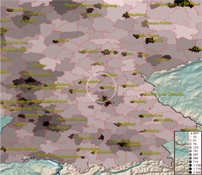Karte ist eine Bevölkerungsdichtekarte. Mehr Details unter bevoelkerung.deu.info
