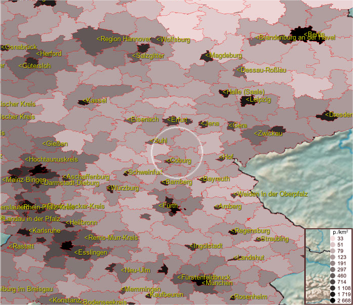 Karte ist eine Bevölkerungsdichtekarte. Mehr Details unter bevoelkerung.deu.info