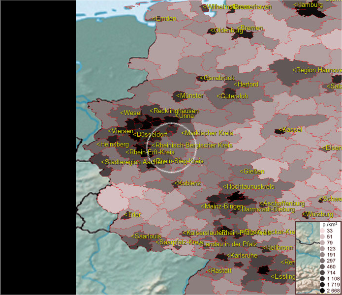 Karte ist eine Bevölkerungsdichtekarte. Mehr Details unter bevoelkerung.deu.info