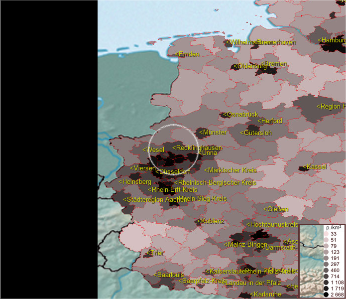 Karte ist eine Bevölkerungsdichtekarte. Mehr Details unter bevoelkerung.deu.info