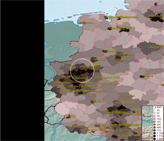 Karte ist eine Bevölkerungsdichtekarte. Mehr Details unter bevoelkerung.deu.info