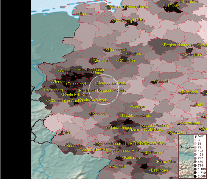 Karte ist eine Bevölkerungsdichtekarte. Mehr Details unter bevoelkerung.deu.info