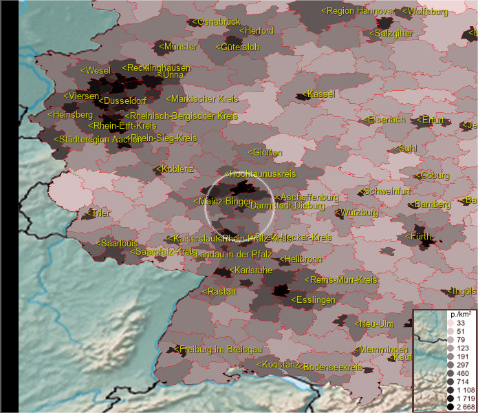 Karte ist eine Bevölkerungsdichtekarte. Mehr Details unter bevoelkerung.deu.info