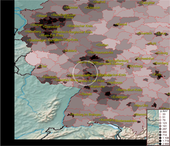 Karte ist eine Bevölkerungsdichtekarte. Mehr Details unter bevoelkerung.deu.info