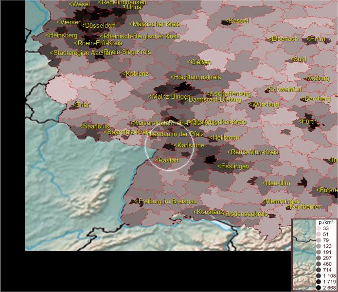 Karte ist eine Bevölkerungsdichtekarte. Mehr Details unter bevoelkerung.deu.info