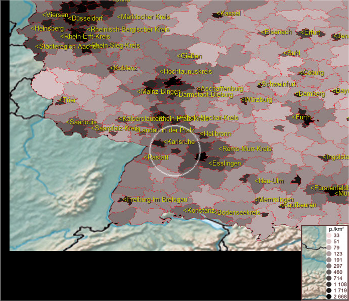 Karte ist eine Bevölkerungsdichtekarte. Mehr Details unter bevoelkerung.deu.info