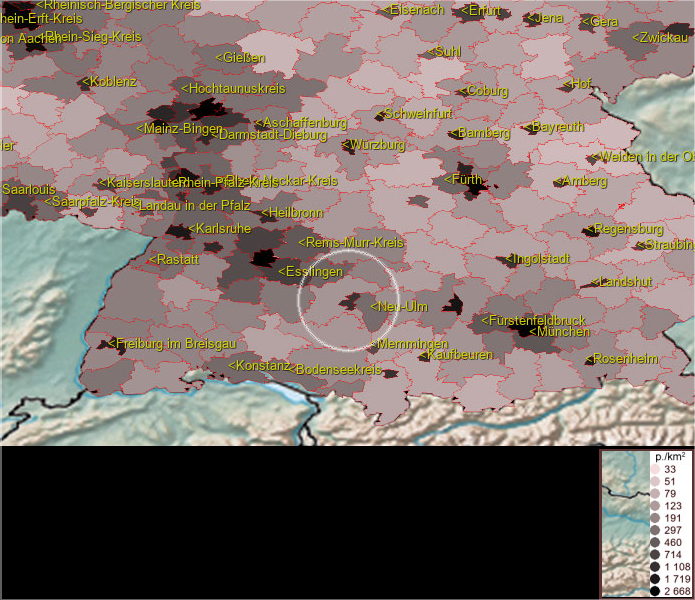 Karte ist eine Bevölkerungsdichtekarte. Mehr Details unter bevoelkerung.deu.info