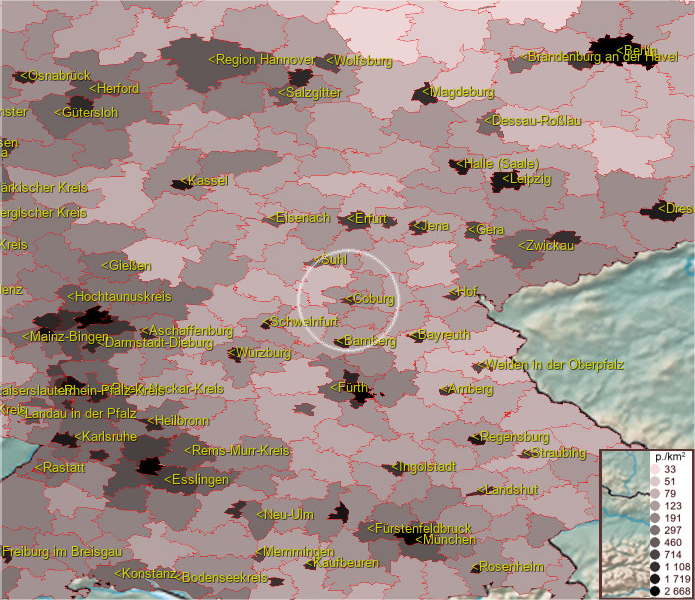 Karte ist eine Bevölkerungsdichtekarte. Mehr Details unter bevoelkerung.deu.info