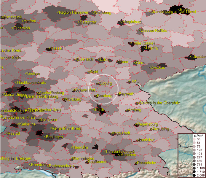 Karte ist eine Bevölkerungsdichtekarte. Mehr Details unter bevoelkerung.deu.info