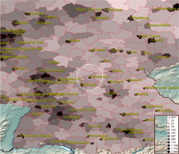 Karte ist eine Bevölkerungsdichtekarte. Mehr Details unter bevoelkerung.deu.info