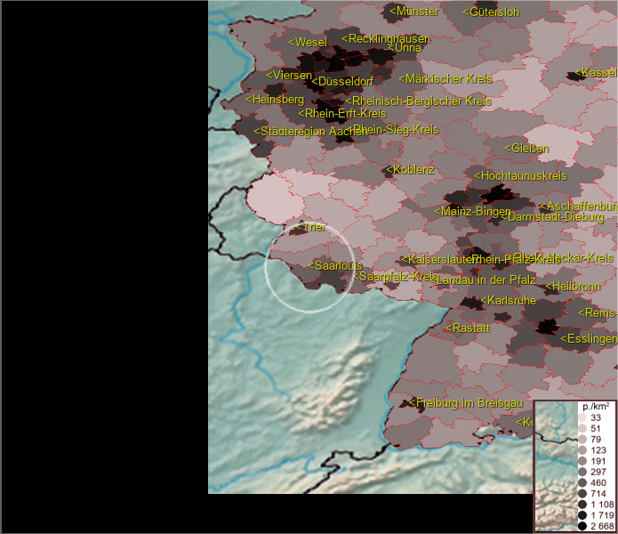 Karte ist eine Bevölkerungsdichtekarte. Mehr Details unter bevoelkerung.deu.info